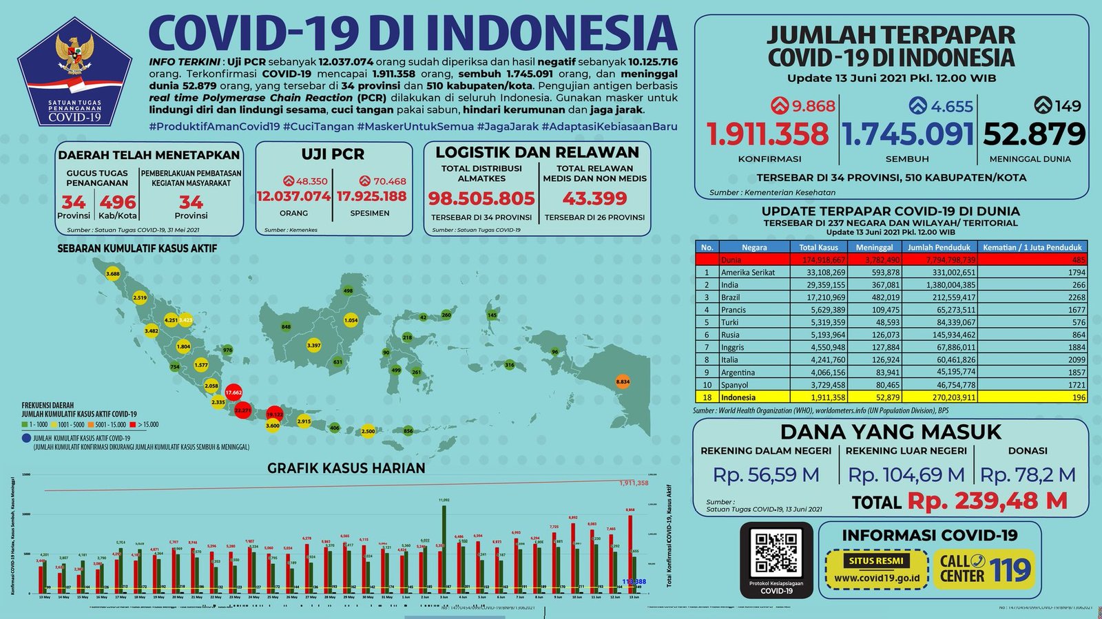 MATTANEWS.CO, JAKARTA– Pemerintah merilis kembali data akumulasi terbaru terkait sebaran kasus Virus Corona (Covid-19). Hingga Minggu (13/6/2021), Jumlah kasus positif virus corona (Covid-19) di Indonesia terus meningkat, bertambah 9.868 Kasus Baru Sehingga total yang positif mencapai 1.911.358 kasus.