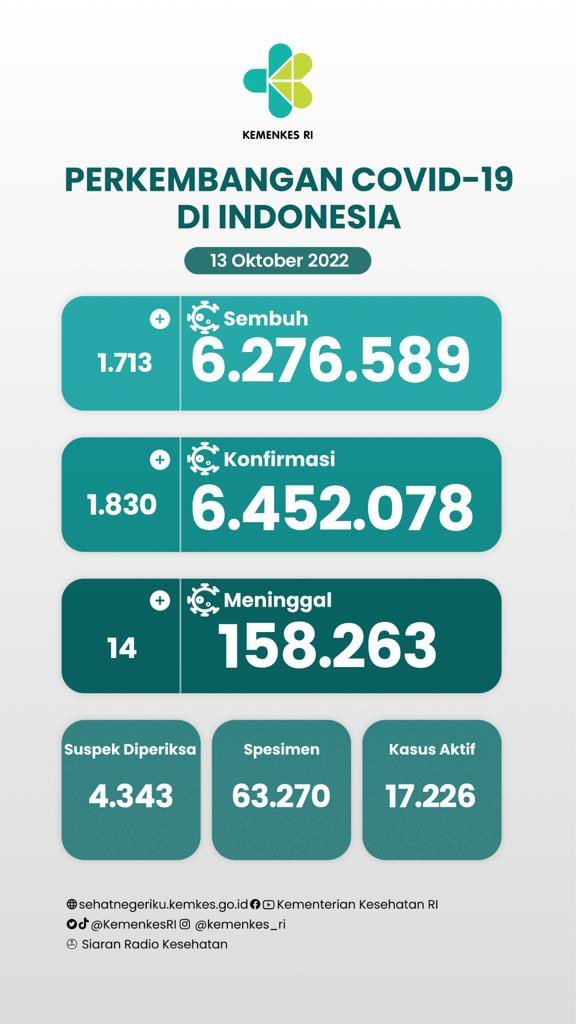 Sebelumnya pada Rabu (12/10/2022), jumlah akumulatif kasus positif berada di angka 6.450.248 dengan 6.274.876 di antaranya sembuh dan 158.249 meninggal dunia.