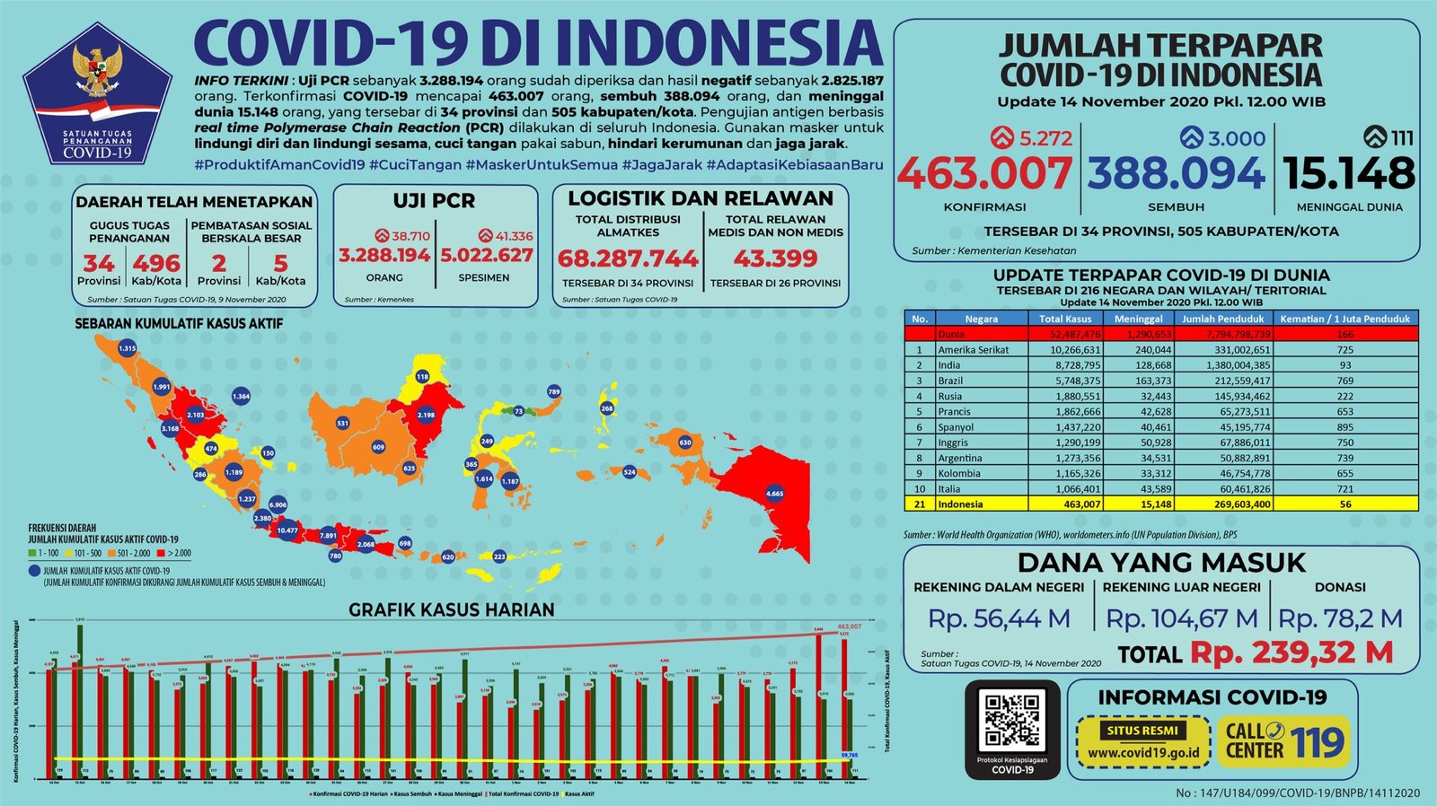 Sebelumnya pada Jumat (13/11/2020), jumlah akumulatif kasus positif berada di angka 457.735 dengan 385.094 di antaranya sembuh dan 15.037 meninggal dunia.