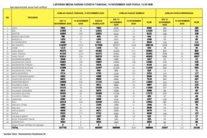 Data Pasien Corona (Covid-19) ini tercatat sejak Jumat, 13 November 2020 pukul 12.00 WIB hingga hari ini, Sabtu, 14 November 2020 pukul 12.00 WIB.