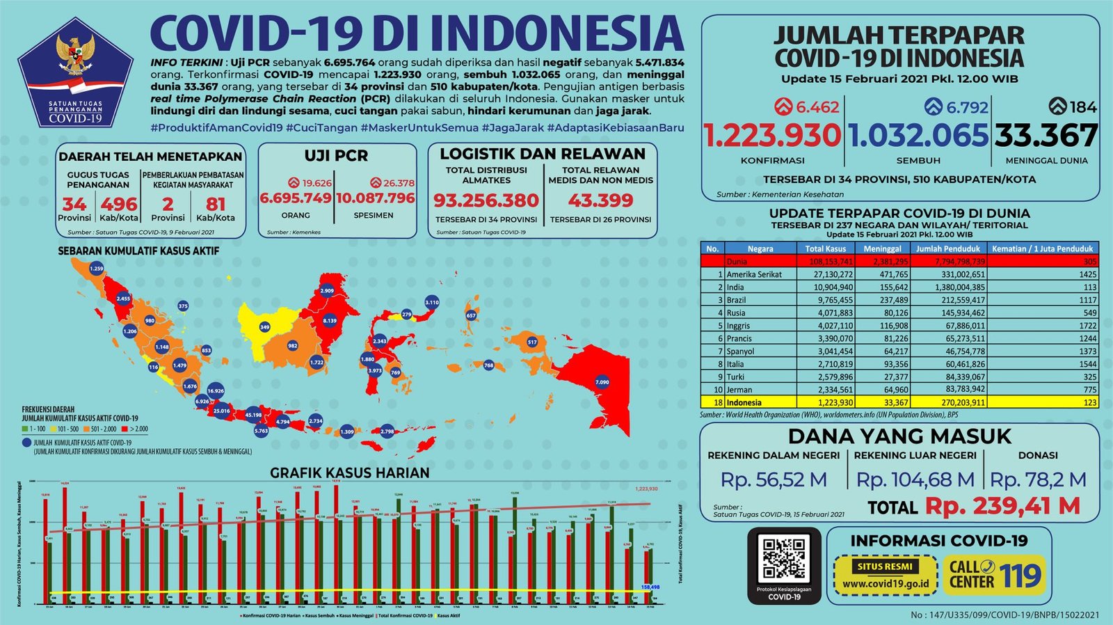 Sebelumnya pada Minggu (14/2/2021), jumlah akumulatif kasus positif berada di angka 1.217.468 dengan 1.025.273 di antaranya sembuh dan 33.183 meninggal dunia.