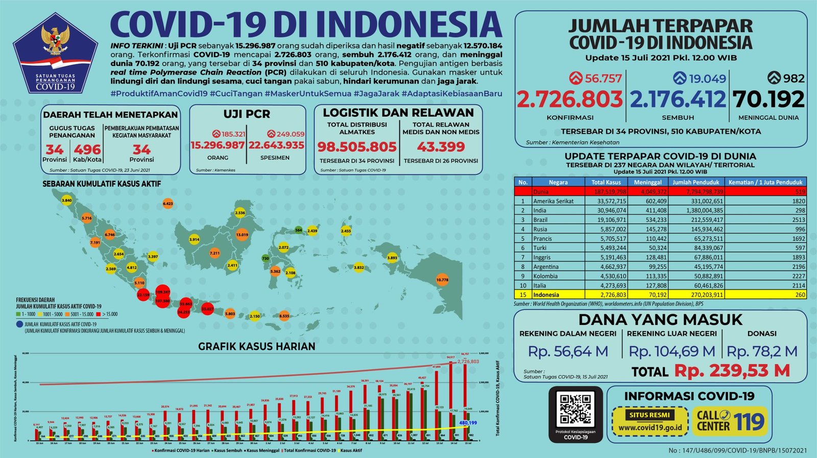 Sebelumnya pada Rabu (14/7/2021), jumlah akumulatif kasus positif berada di angka 2.670.046 dengan 2.157.363 di antaranya sembuh dan 69.210 meninggal dunia.