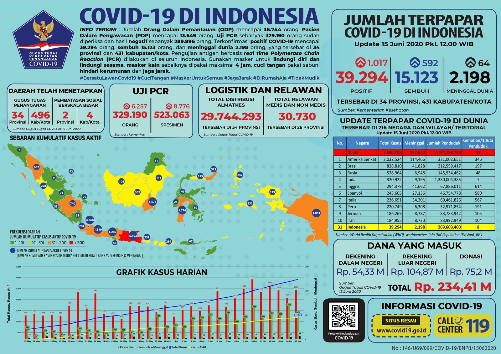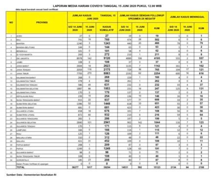 Data pasien Corona (Covid-19) ini tercatat sejak Minggu 14 Juni 2020 pukul 12.00 WIB hingga hari ini Senin 15 Juni 2020 pukul 12.00 WIB.