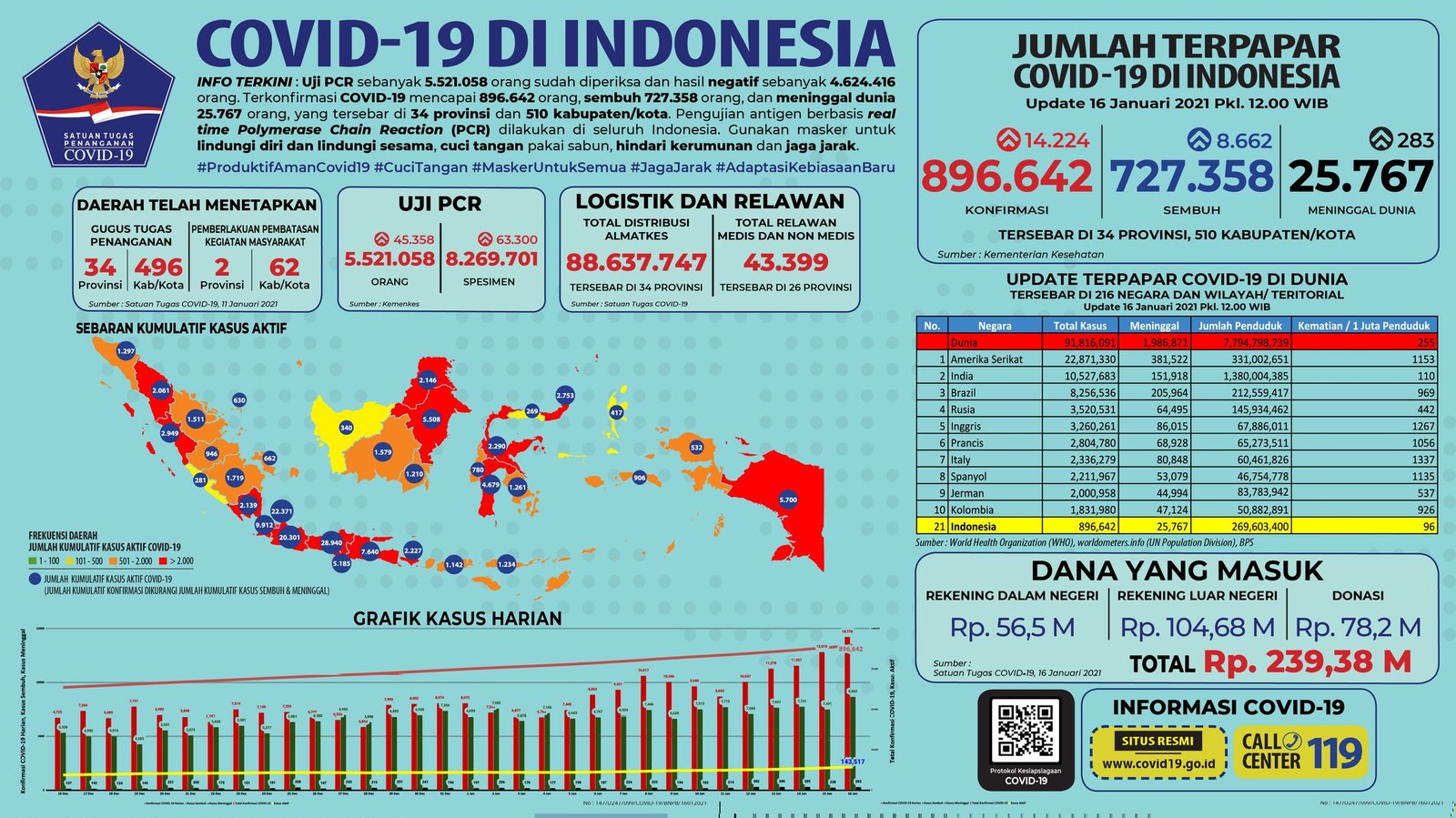 Data Pasien Corona (Covid-19) ini tercatat sejak Jumat, 15 Januari 2021 pukul 12.00 WIB hingga hari ini, Sabtu, 16 Januari 2021 pukul 12.00 WIB.