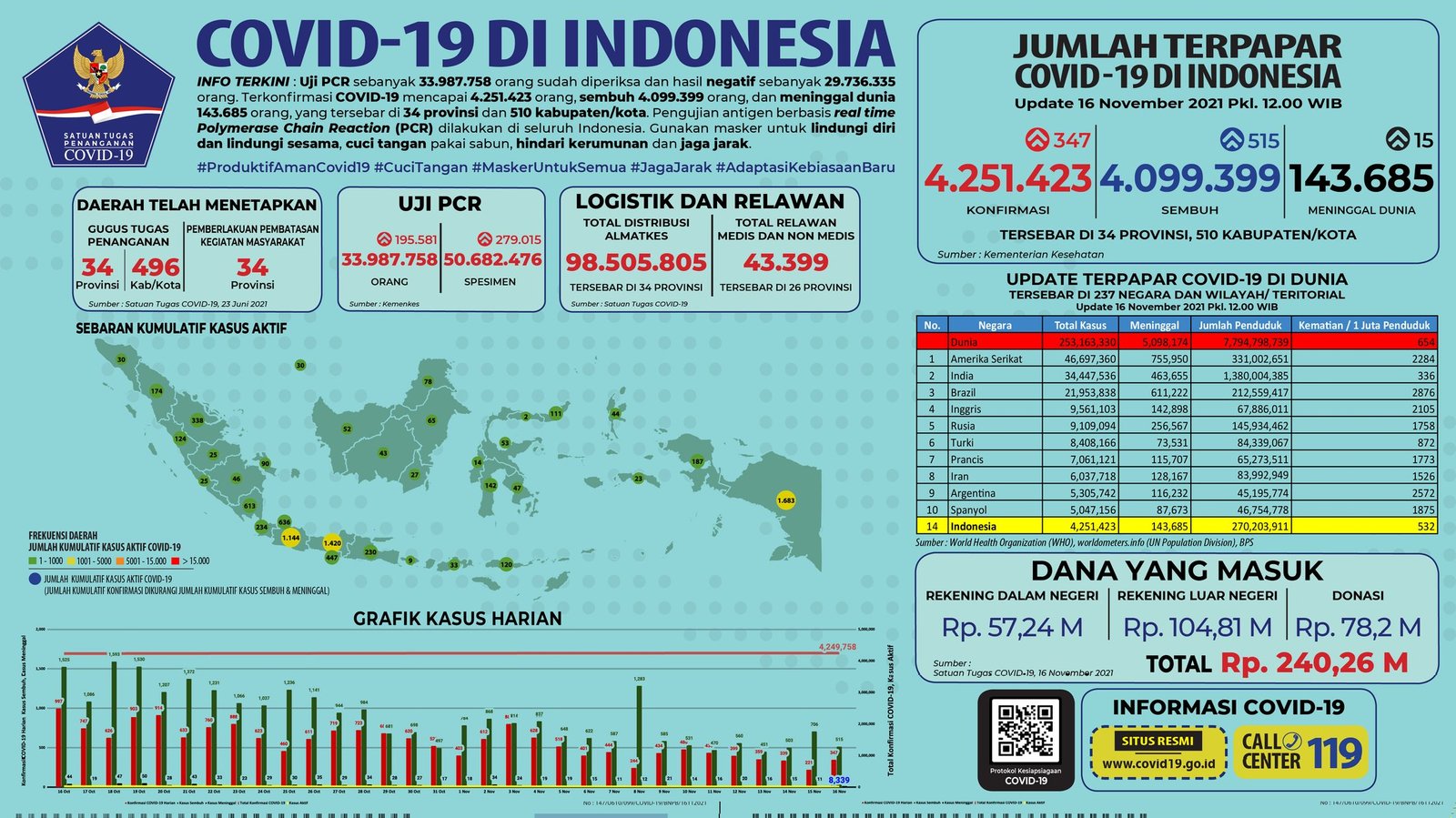 Sebelumnya pada Senin (15/11/2021), jumlah akumulatif kasus positif berada di angka 4.251.076 dengan 4.098.884 di antaranya sembuh dan 143.670 meninggal dunia.