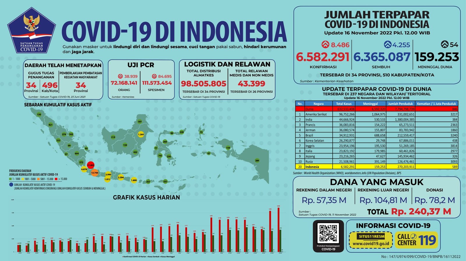 Sebelumnya pada Selasa (15/11/2022), jumlah akumulatif kasus positif berada di angka 6.573.805 dengan 6.360.832 di antaranya sembuh dan 159.199 meninggal dunia.