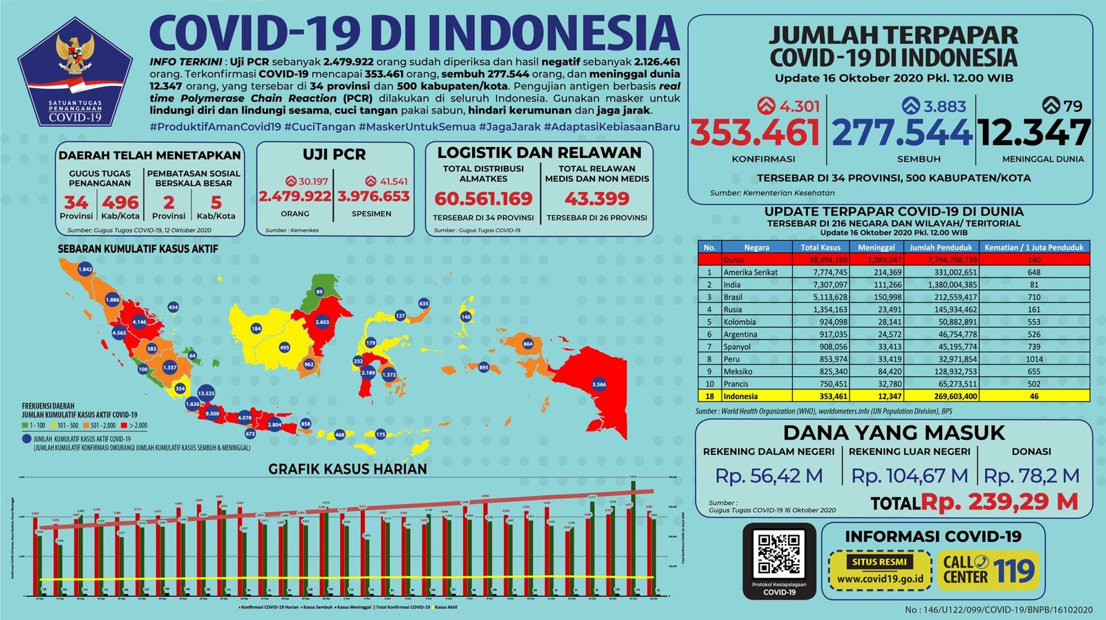 Sebelumnya pada Kamis (15/10/2020), jumlah akumulatif kasus positif berada di angka 349.160 dengan 273.661 di antaranya sembuh dan 12.268 meninggal dunia.