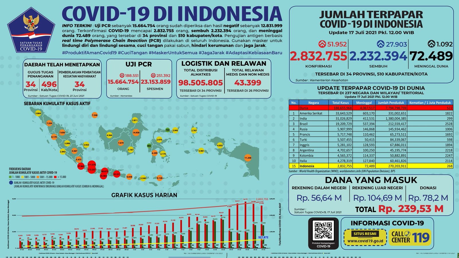 Update 17 Juli 2021 Korban Covid-19 di Indonesia: 2.832.755 Positif, 2.232.394 Sembuh, 72.489 Meninggal