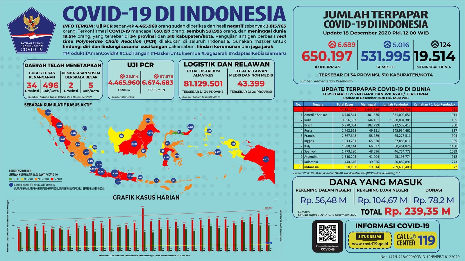 JAKARTA, Mattanews.co– Pemerintah merilis kembali data akumulasi terbaru terkait sebaran kasus Virus Corona (Covid-19). Hingga Jumat (18/12/2020), Jumlah kasus positif virus corona (Covid-19) di Indonesia terus meningkat, bertambah 6.689 Kasus Baru Sehingga total yang positif mencapai 650.197 kasus.