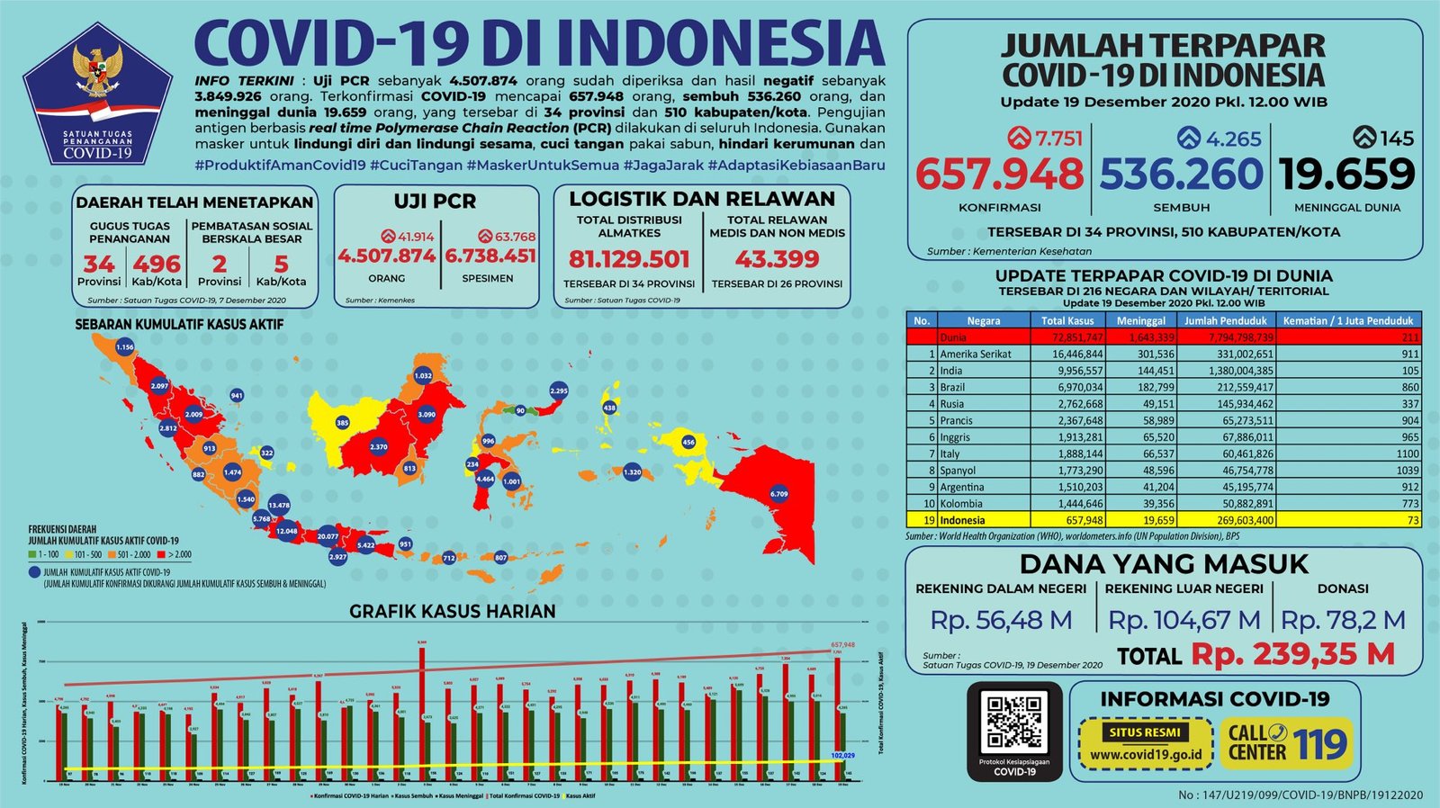 Sebelumnya pada Jumat (18/12/2020), jumlah akumulatif kasus positif berada di angka 650.197 dengan 531.995 di antaranya sembuh dan 19.514 meninggal dunia.