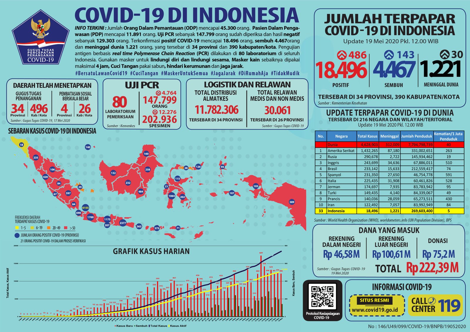 JAKARTA, Mattanews.co– Pemerintah merilis kembali data akumulasi terbaru terkait sebaran kasus Virus Corona (Covid-19). Hingga Selasa (19/5/2020), Jumlah kasus positif virus corona (Covid-19) di Indonesia terus meningkat, bertambah 486 Kasus Baru Sehingga total yang positif mencapai 18.496 kasus.