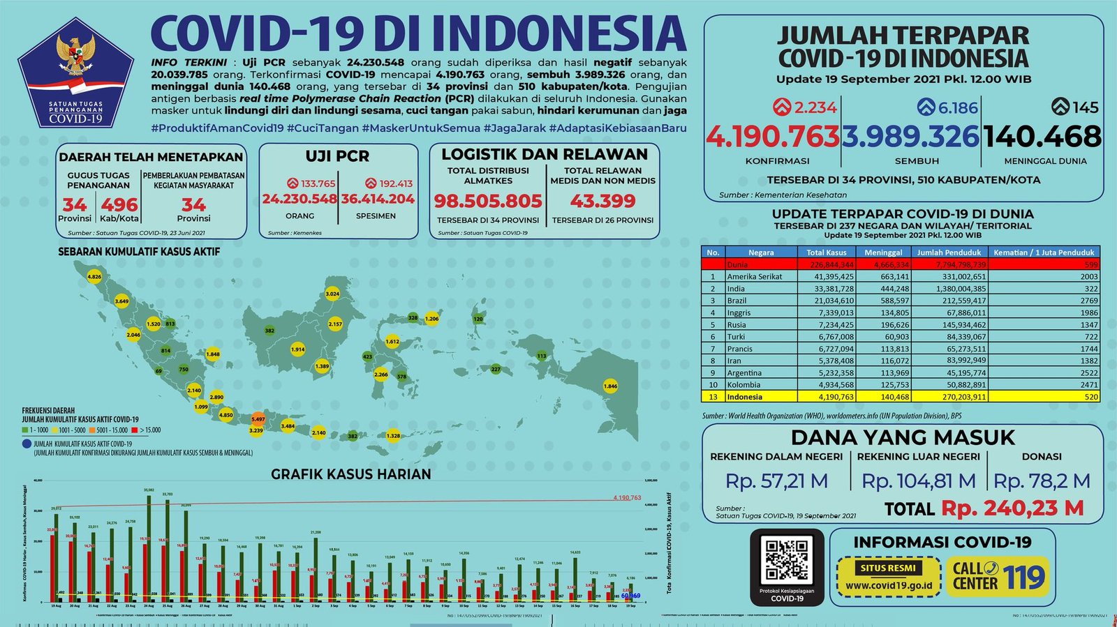 Sebelumnya pada Sabtu (18/9/2021), jumlah akumulatif kasus positif berada di angka 4.188.529 dengan 3.983.140 di antaranya sembuh dan 140.323 meninggal dunia.