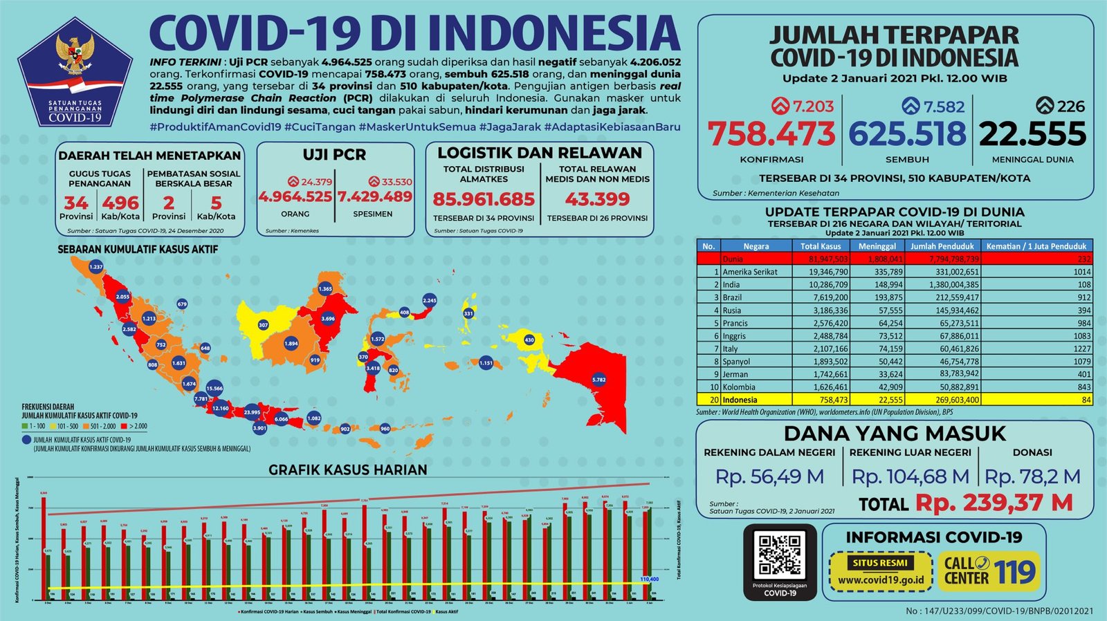 JAKARTA, Mattanews.co– Pemerintah merilis kembali data akumulasi terbaru terkait sebaran kasus Virus Corona (Covid-19). Hingga Sabtu (2/1/2020), Jumlah kasus positif virus corona (Covid-19) di Indonesia terus meningkat, bertambah 7.205 Kasus Baru Sehingga total yang positif mencapai 758.473 kasus.