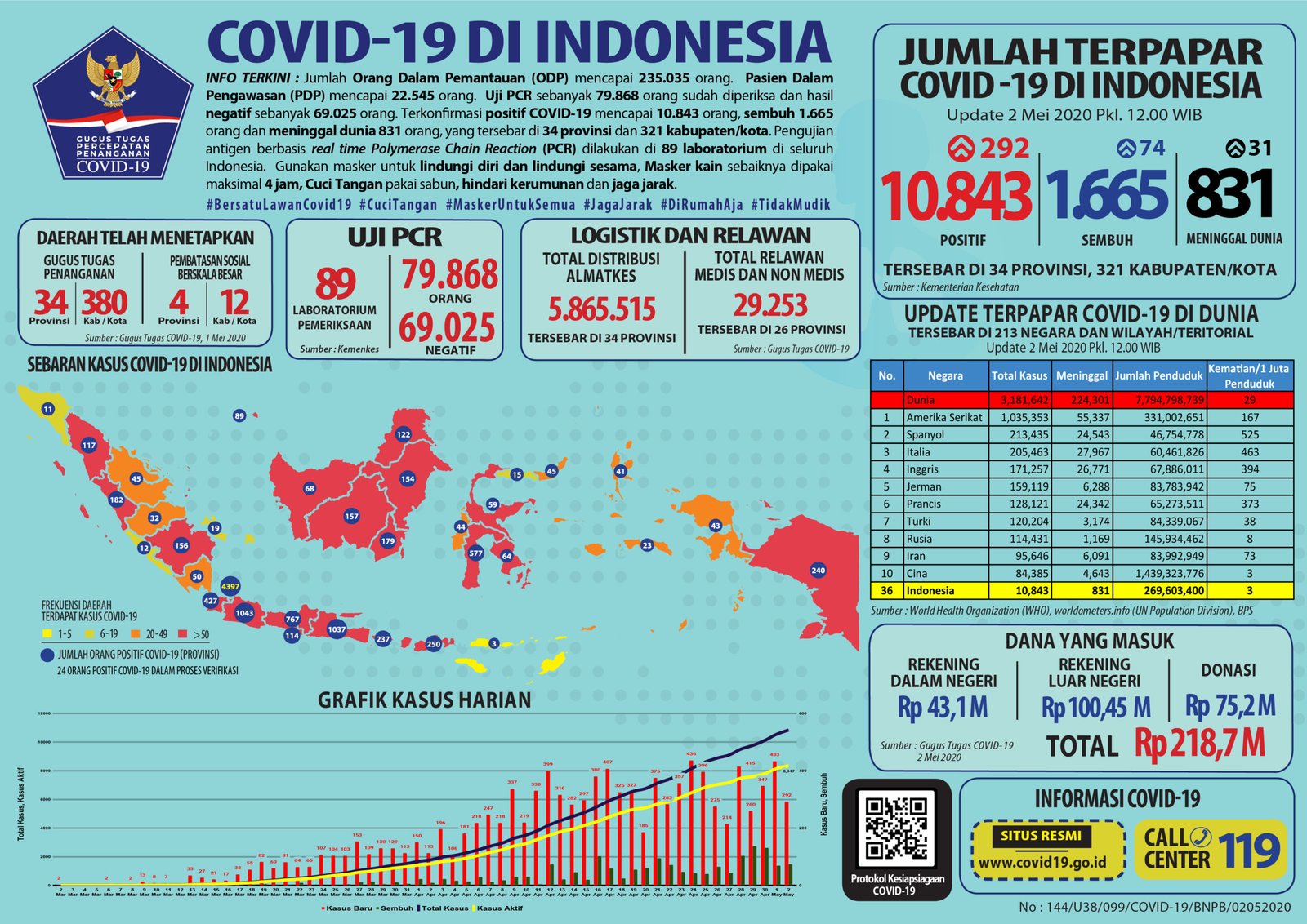 JAKARTA, Mattanews.co– Pemerintah merilis kembali data akumulasi terbaru terkait sebaran kasus Virus Corona (Covid-19). Hingga Sabtu (2/5/2020), Jumlah kasus positif virus corona (Covid-19) di Indonesia terus meningkat, bertambah 292 Kasus Sehingga total yang positif mencapai 10.843 kasus.