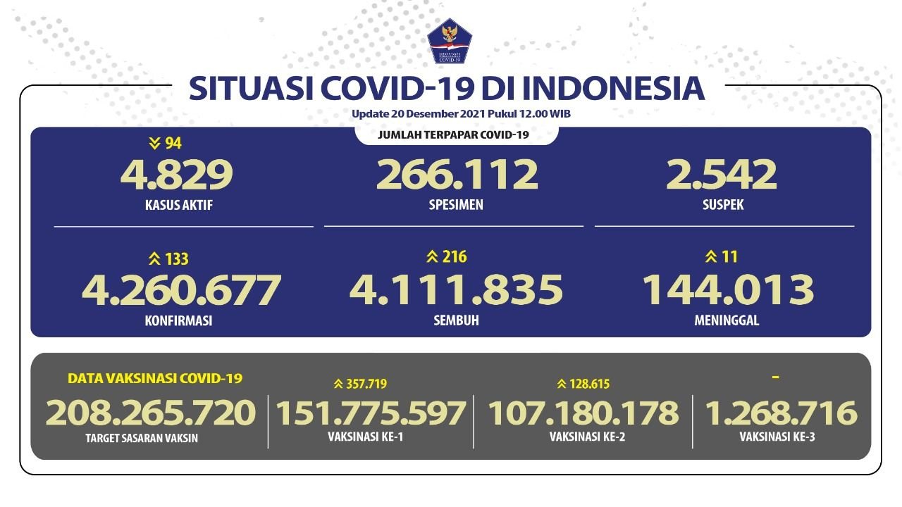 Sebelumnya pada Minggu (19/12/2021), jumlah akumulatif kasus positif berada di angka 4.260.544 dengan 4.111.619 di antaranya sembuh dan 144.002 meninggal dunia.