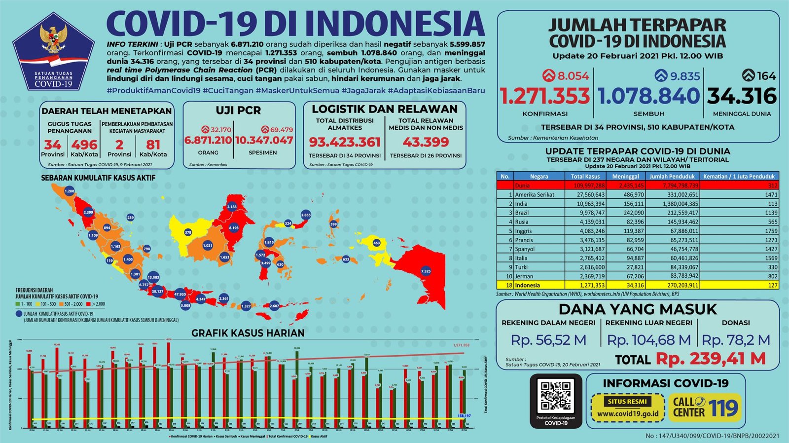 Sebelumnya pada Jumat (19/2/2021), jumlah akumulatif kasus positif berada di angka 1.263.299 dengan 1.069.005 di antaranya sembuh dan 34.152 meninggal dunia.