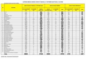 JAKARTA, Mattanews.co– Pemerintah merilis kembali data akumulasi terbaru terkait sebaran kasus Virus Corona (Covid-19). Hingga Rabu (21/10/2020), Jumlah kasus positif virus corona (Covid-19) di Indonesia terus meningkat, bertambah 4.267 Kasus Baru Sehingga total yang positif mencapai 373.109 kasus.