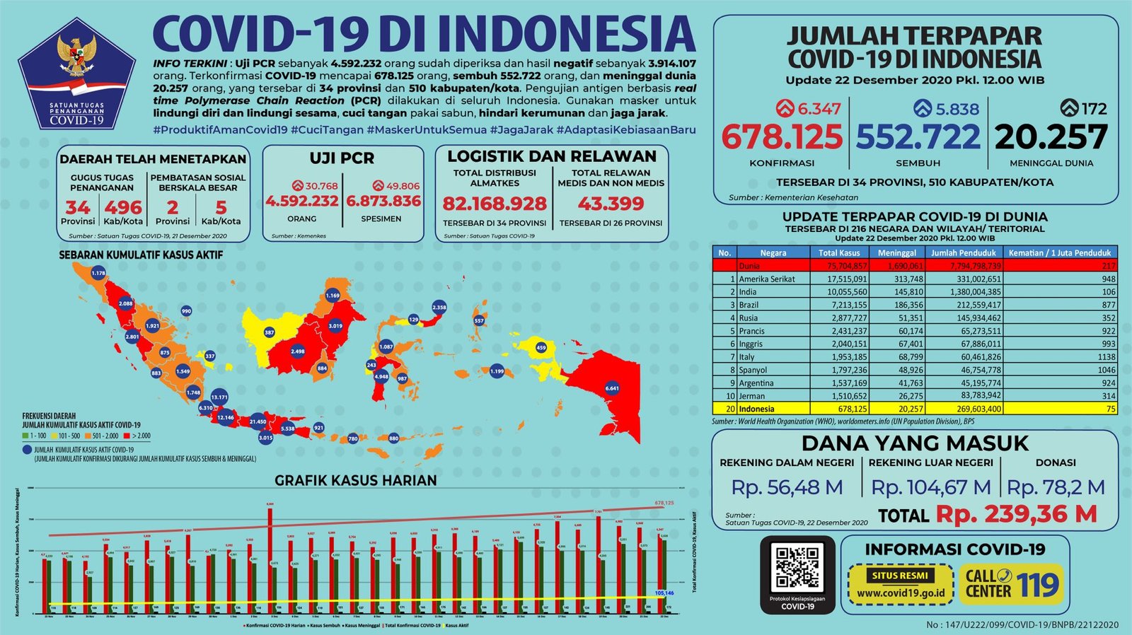 JAKARTA, Mattanews.co– Pemerintah merilis kembali data akumulasi terbaru terkait sebaran kasus Virus Corona (Covid-19). Hingga Selasa (22/12/2020), Jumlah kasus positif virus corona (Covid-19) di Indonesia terus meningkat, bertambah 6.347 Kasus Baru Sehingga total yang positif mencapai 678.125 kasus.
