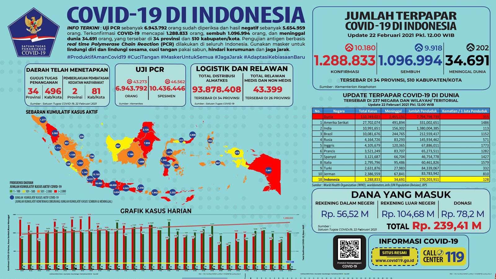 Sebelumnya pada Minggu (21/2/2021), jumlah akumulatif kasus positif berada di angka 1.278.653 dengan 1.087.076 di antaranya sembuh dan 34.489 meninggal dunia.