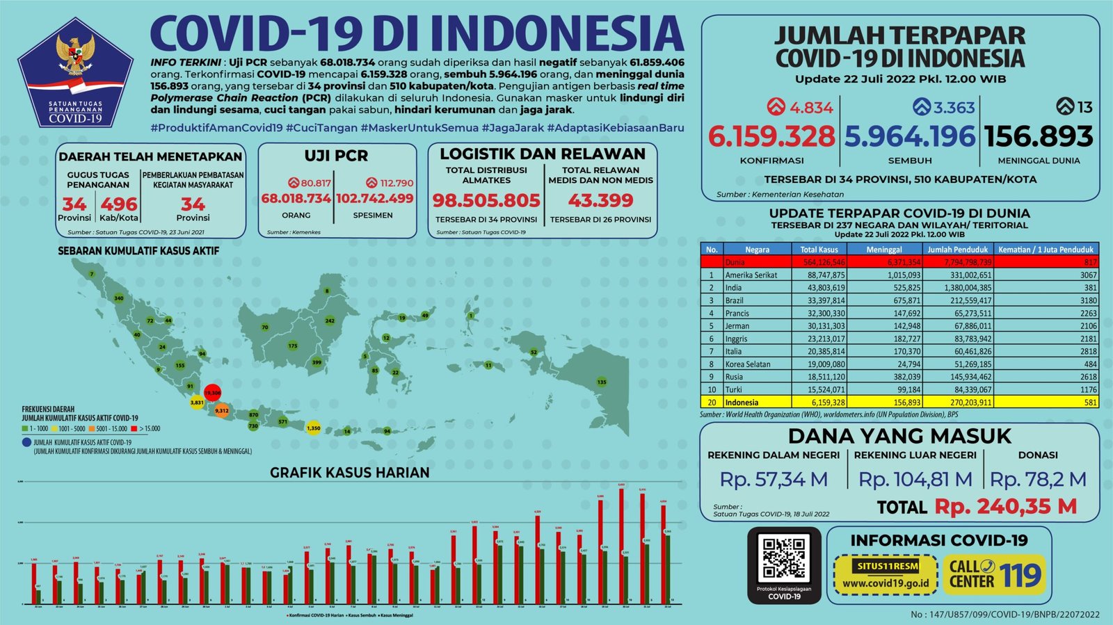 Data Pasien Corona (Covid-19) ini tercatat sejak Kamis 21 Juli 2022 pukul 12.00 WIB hingga hari ini, Jumat 22 Juli 2022 pukul 12.00 WIB.