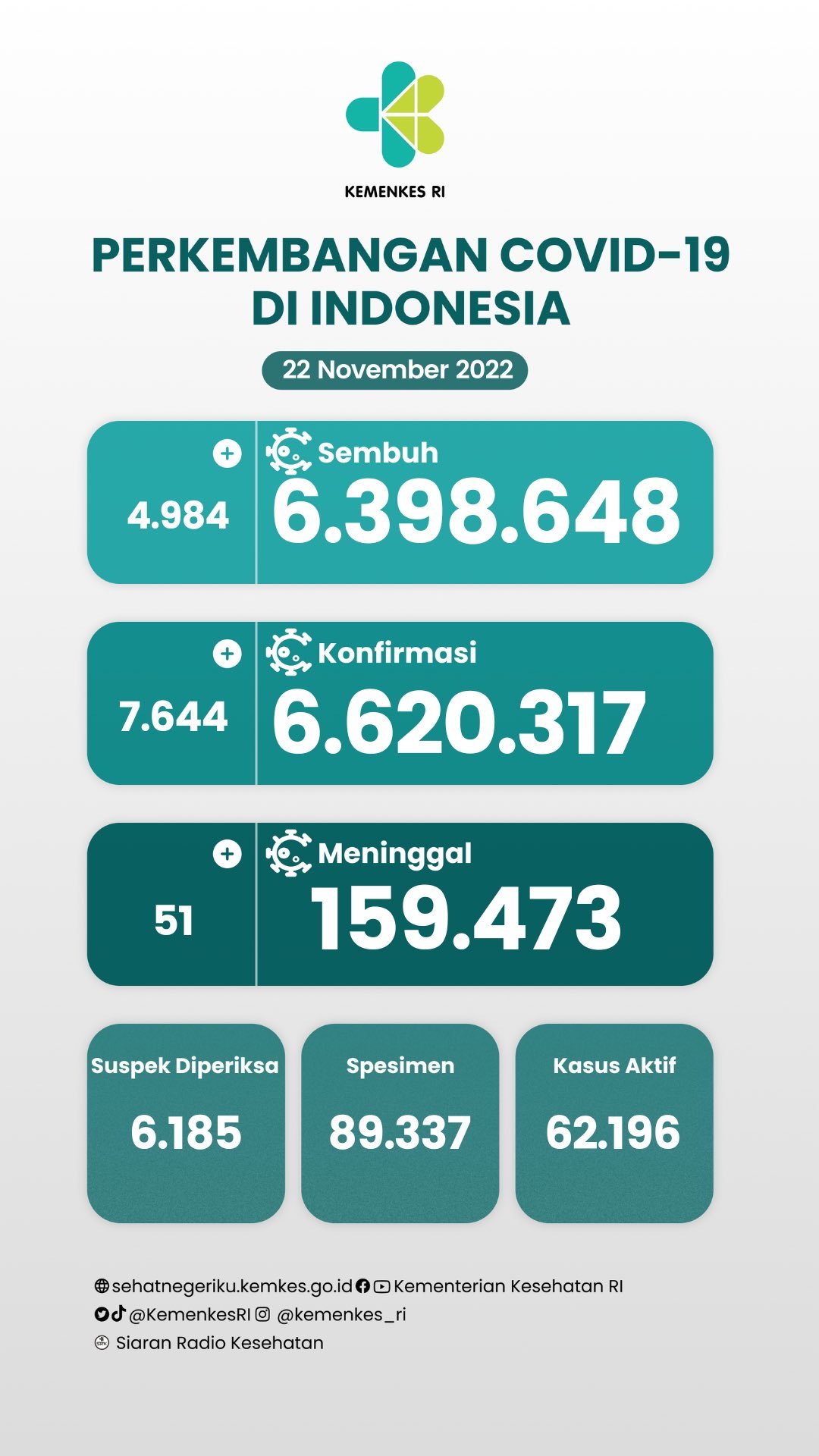 Sebelumnya pada Senin (21/11/2022), jumlah akumulatif kasus positif berada di angka 6.612.673 dengan 6.393.664 di antaranya sembuh dan 159.422 meninggal dunia.