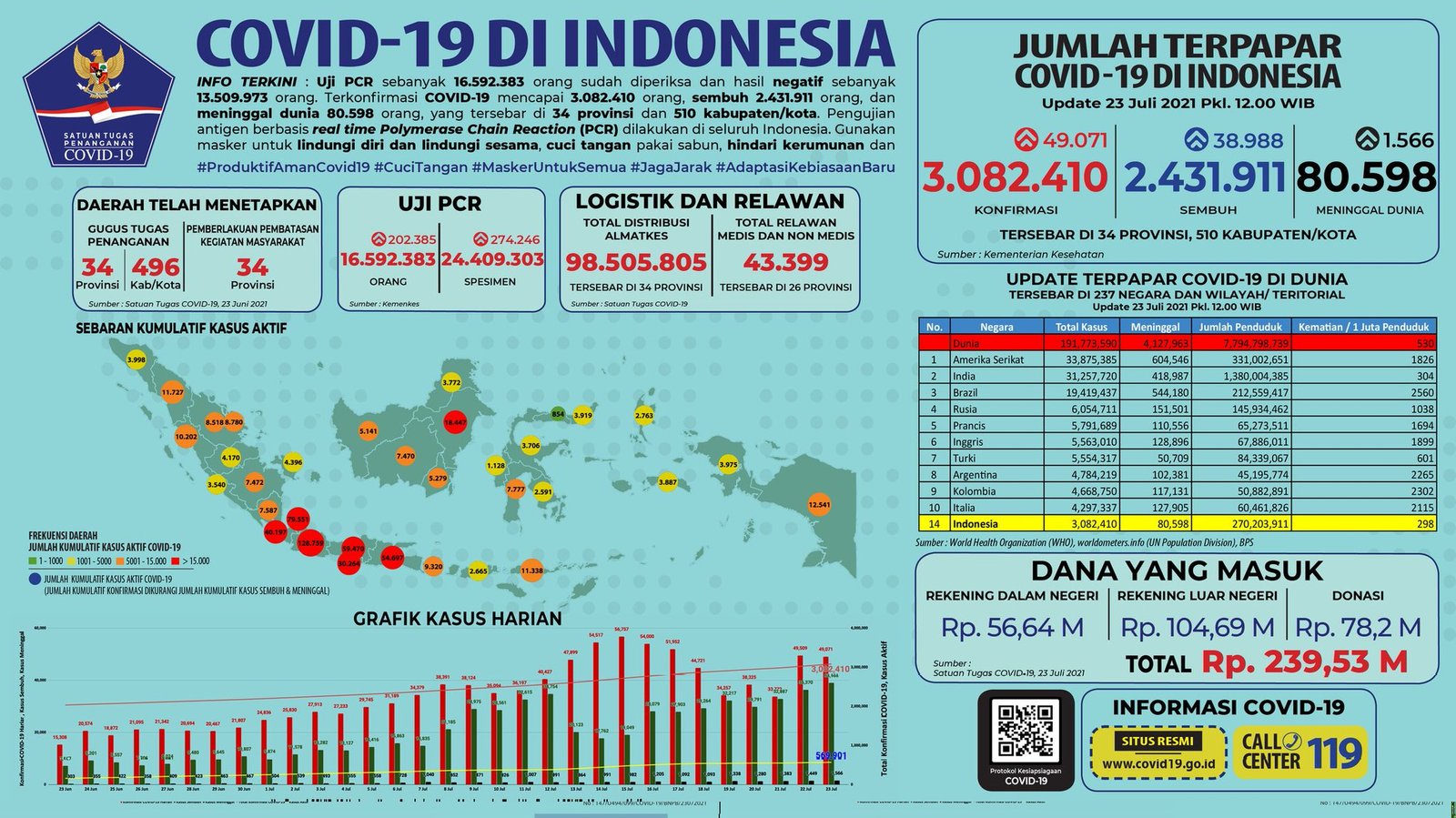Update 23 Juli 2021 Korban Covid-19 di Indonesia: 3.082.410 Positif, 2.431.911 Sembuh, 80.598 Meninggal