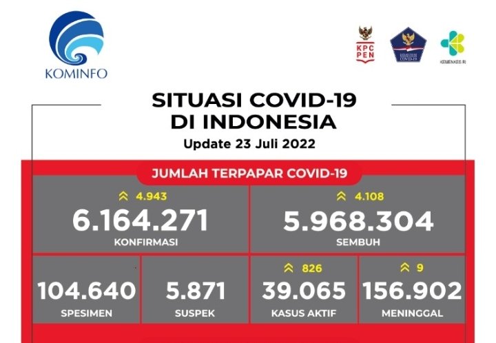 MATTANEWS.CO, JAKARTA– Pemerintah merilis kembali data akumulasi terbaru terkait sebaran kasus Virus Corona (Covid-19). Hingga Sabtu (23/7/2022), Jumlah kasus positif virus corona (Covid-19) di Indonesia terus meningkat, bertambah 4.943 Kasus Baru Sehingga total yang positif mencapai 6.164.271 kasus.