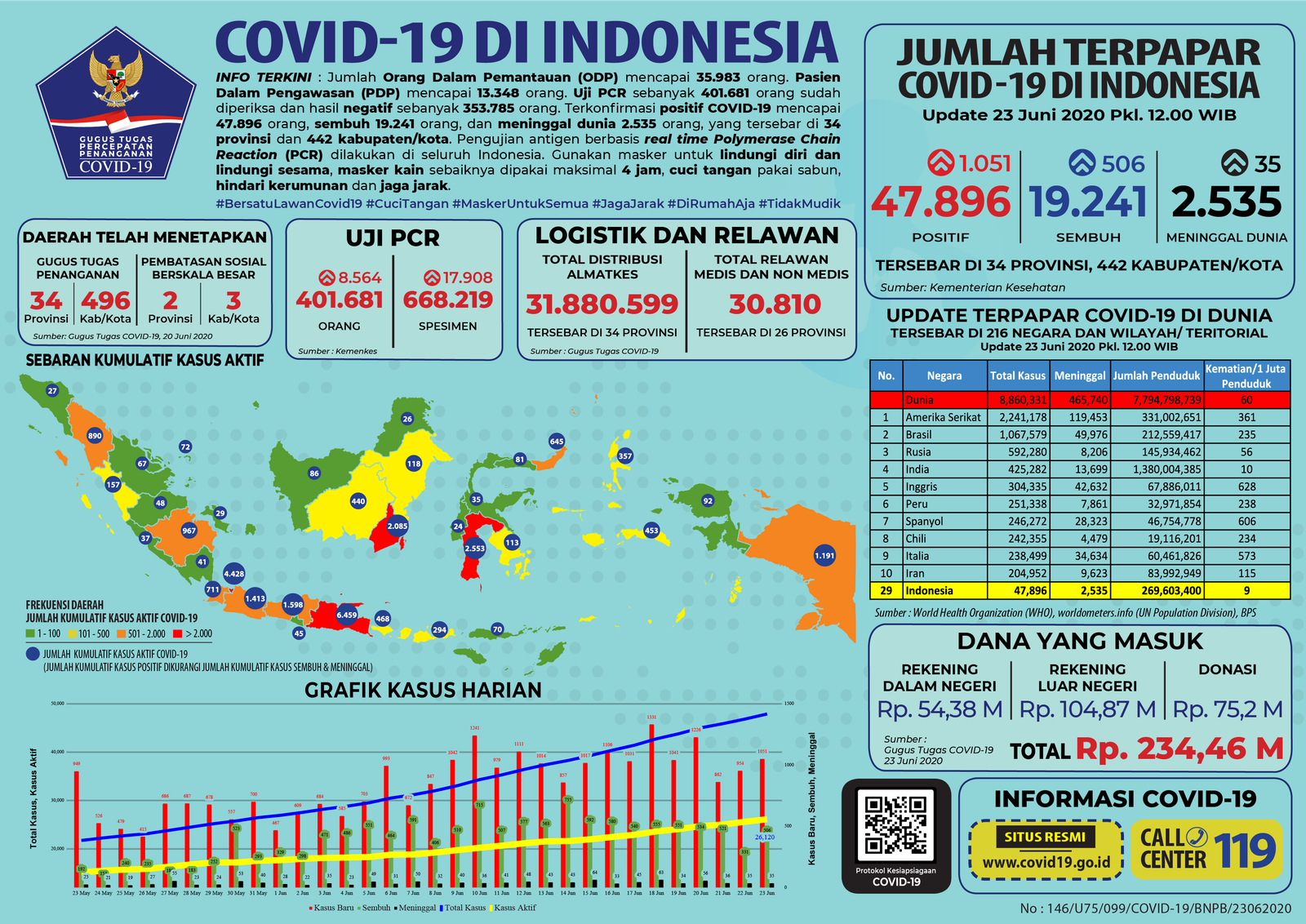 JAKARTA, Mattanews.co– Pemerintah merilis kembali data akumulasi terbaru terkait sebaran kasus Virus Corona (Covid-19). Hingga Selasa (23/6/2020), Jumlah kasus positif virus corona (Covid-19) di Indonesia terus meningkat, bertambah 1.051 Kasus Baru Sehingga total yang positif mencapai 47.896 kasus.