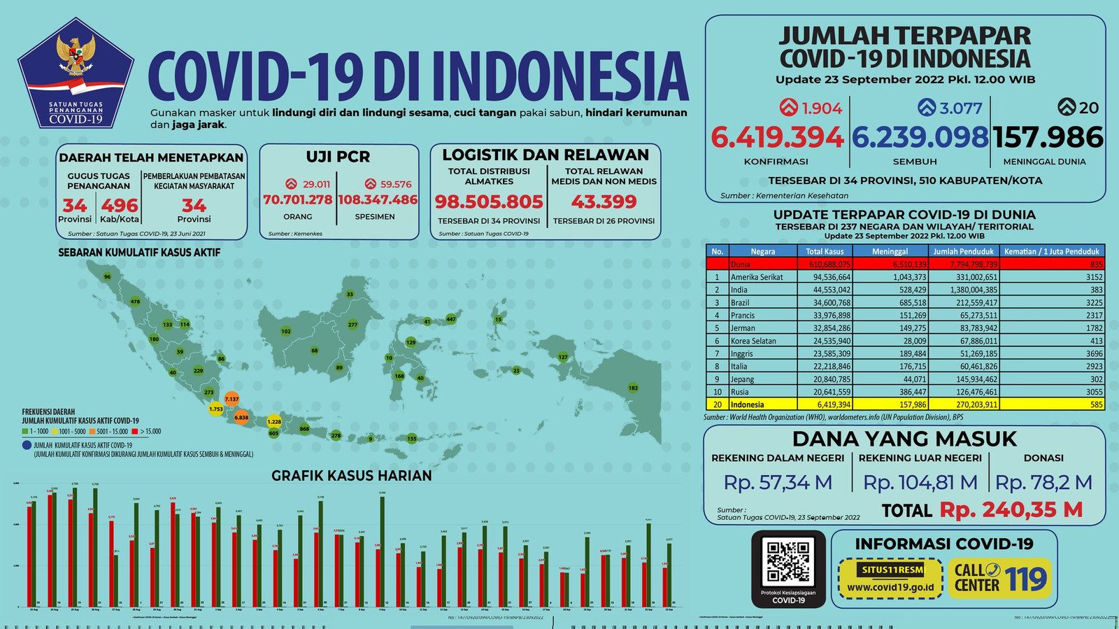 Sebelumnya pada Kamis (22/9/2022), jumlah akumulatif kasus positif berada di angka 6.417.490 dengan 6.236.021 di antaranya sembuh dan 157.966 meninggal dunia.