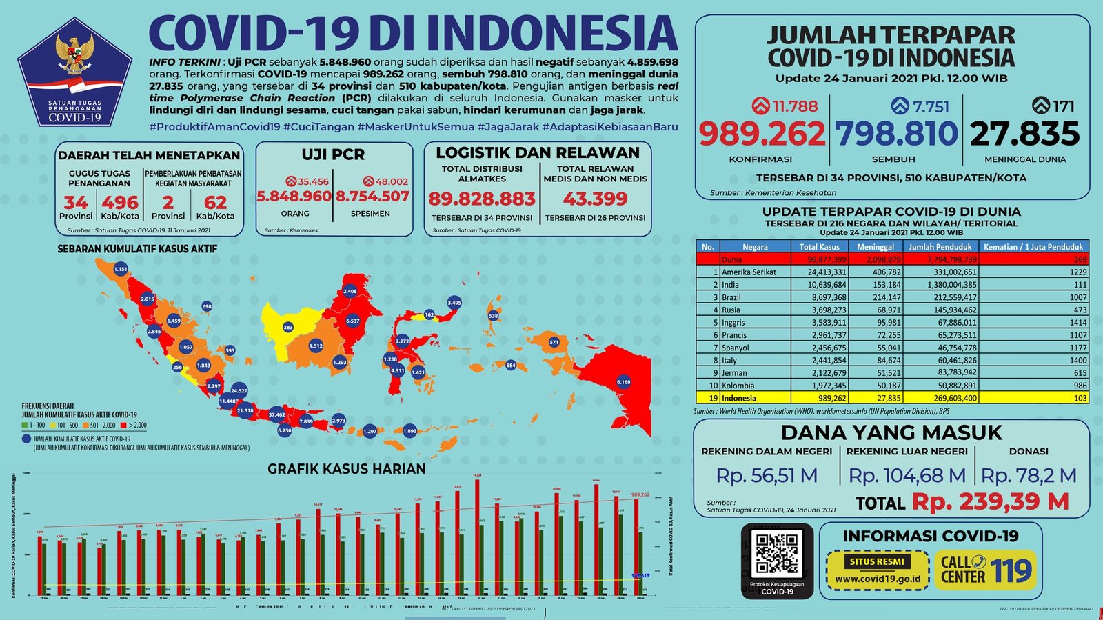 JAKARTA, Mattanews.co– Pemerintah merilis kembali data akumulasi terbaru terkait sebaran kasus Virus Corona (Covid-19). Hingga Minggu (24/1/2021), Jumlah kasus positif virus corona (Covid-19) di Indonesia terus meningkat, bertambah 11.788 Kasus Baru Sehingga total yang positif mencapai 989.262 kasus.