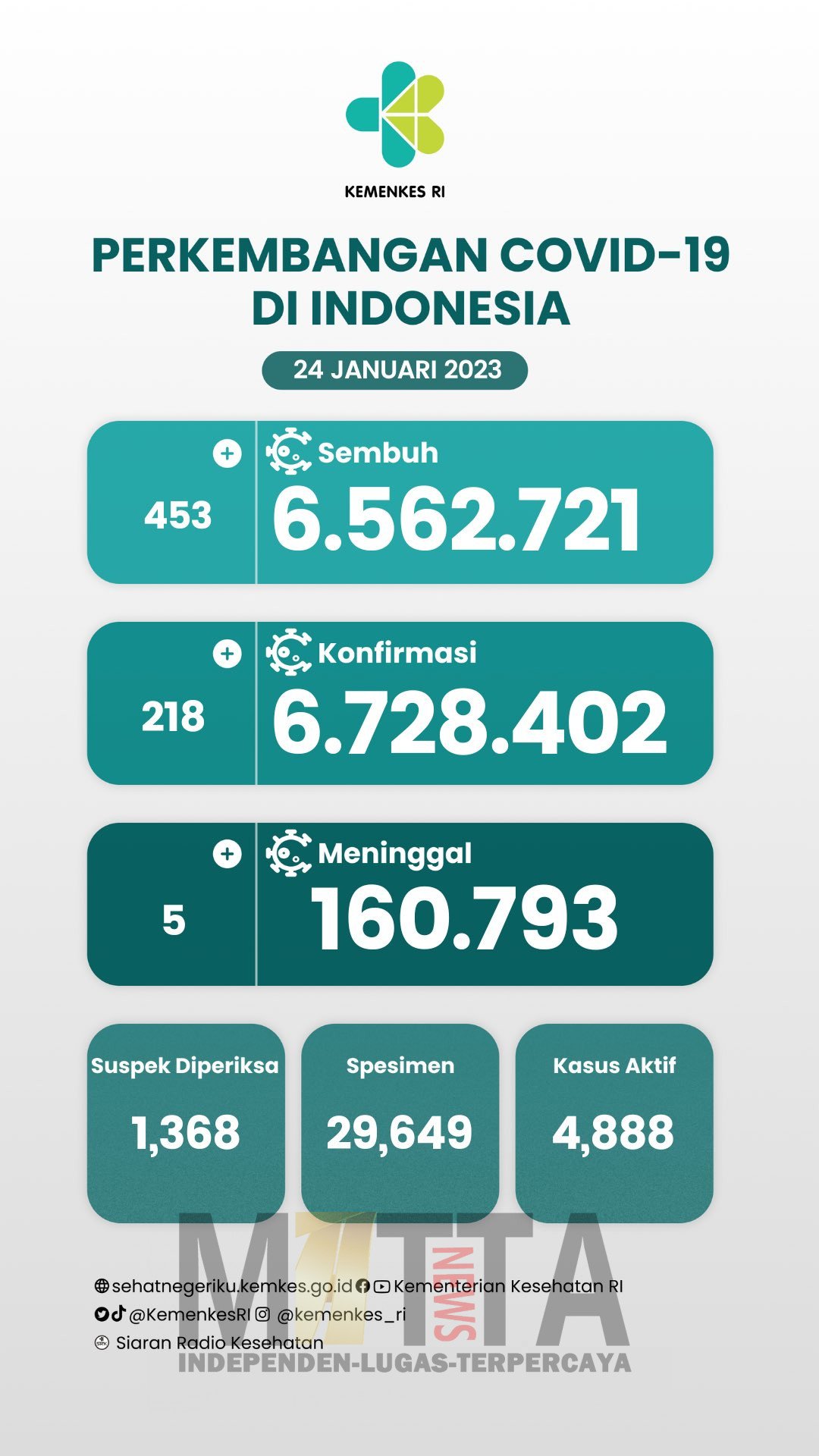 MATTANEWS.CO, JAKARTA– Pemerintah merilis kembali data akumulasi terbaru terkait sebaran kasus Virus Corona (Covid-19). Hingga hari Selasa (24/1/2023), Jumlah kasus positif virus corona (Covid-19) di Indonesia terus meningkat, bertambah 218 Kasus Baru Sehingga total yang positif mencapai 6.728.402 kasus.