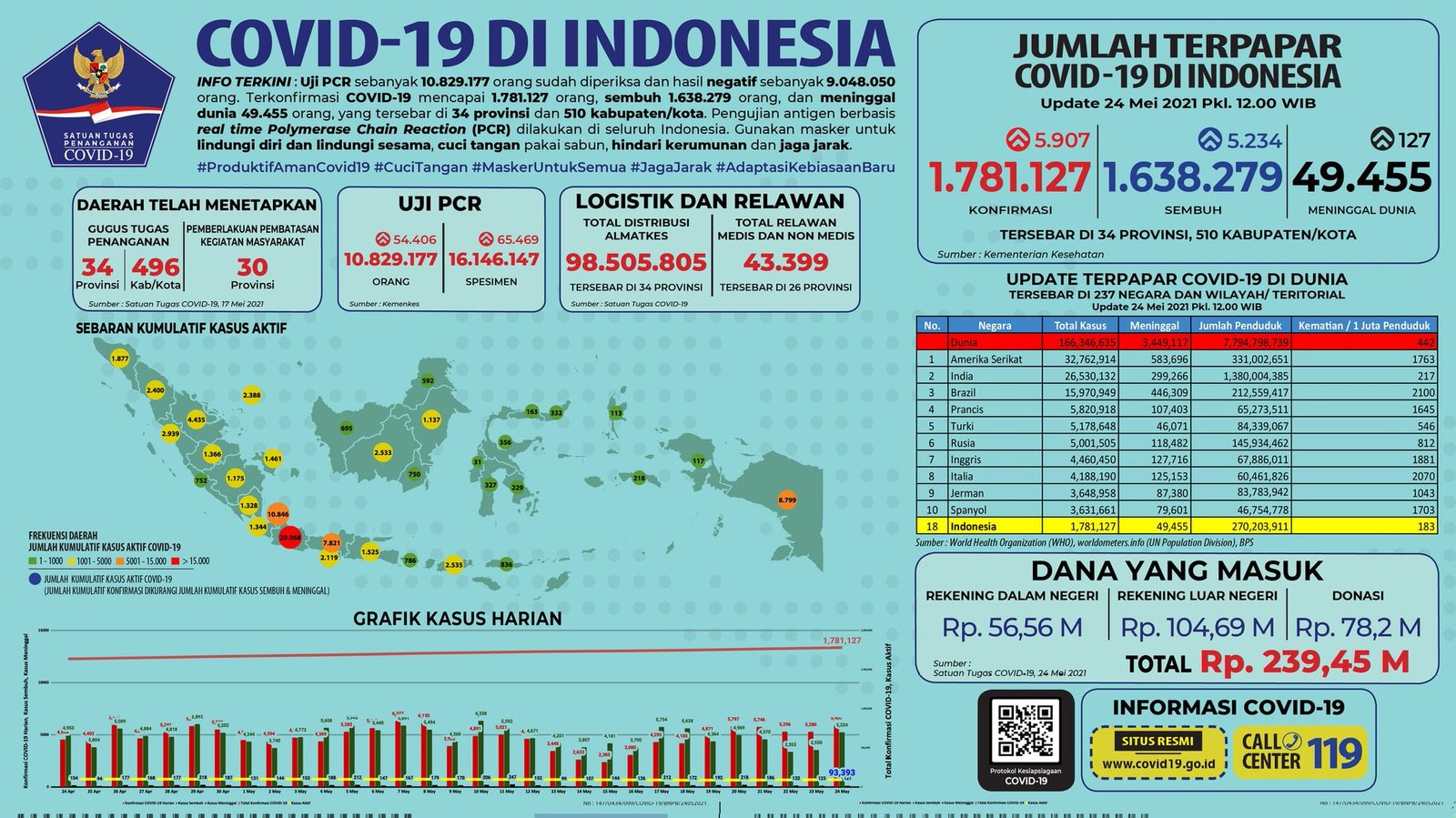 Update 24 Mei 2021 Korban Covid-19 di Indonesia: 1.781.127 Positif, 1.638.279 Sembuh, 49.455 Meninggal