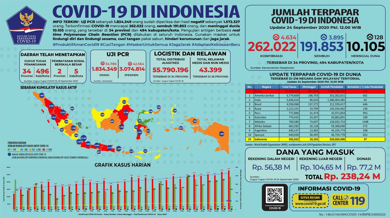 JAKARTA, Mattanews.co– Pemerintah merilis kembali data akumulasi terbaru terkait sebaran kasus Virus Corona (Covid-19). Hingga Kamis (24/9/2020), Jumlah kasus positif virus corona (Covid-19) di Indonesia terus meningkat, bertambah 4.634 Kasus Baru Sehingga total yang positif mencapai 262.022 kasus.