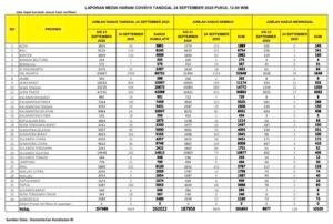 Data pasien Corona (Covid-19) ini tercatat sejak Rabu, 23 September 2020 pukul 12.00 WIB hingga hari ini, Kamis, 24 September 2020 pukul 12.00 WIB.