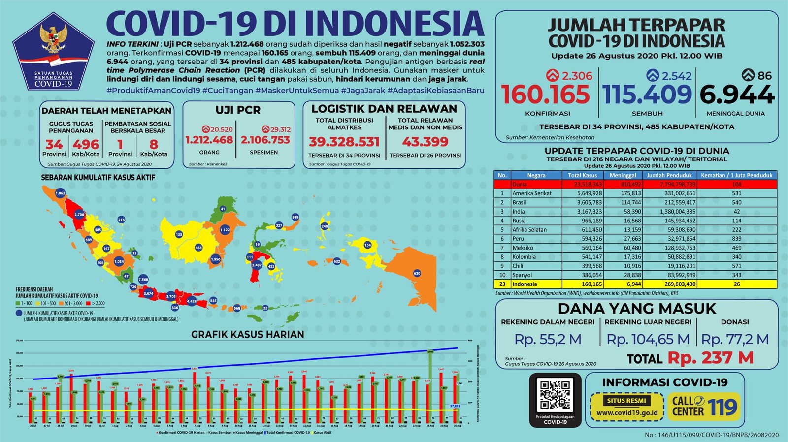Sebelumnya pada Selasa (25/8/2020), jumlah akumulatif kasus positif berada di angka 157.859 dengan 112.867 di antaranya sembuh dan 6.858 meninggal dunia.