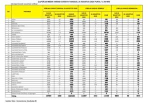JAKARTA, Mattanews.co– Pemerintah merilis kembali data akumulasi terbaru terkait sebaran kasus Virus Corona (Covid-19). Hingga Rabu (26/8/2020), Jumlah kasus positif virus corona (Covid-19) di Indonesia terus meningkat, bertambah 2.306 Kasus Baru Sehingga total yang positif mencapai 160.165 kasus.