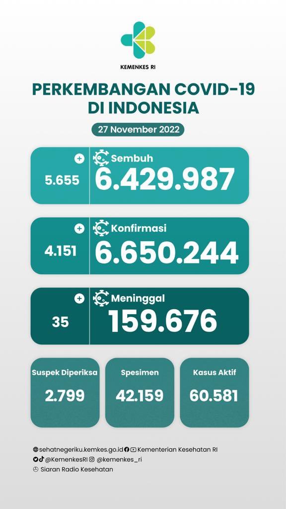 MATTANEWS.CO, JAKARTA– Pemerintah merilis kembali data akumulasi terbaru terkait sebaran kasus Virus Corona (Covid-19). Hingga hari Minggu (27/11/2022), Jumlah kasus positif virus corona (Covid-19) di Indonesia terus meningkat, bertambah 4.151 Kasus Baru Sehingga total yang positif mencapai 6.650.244 kasus.