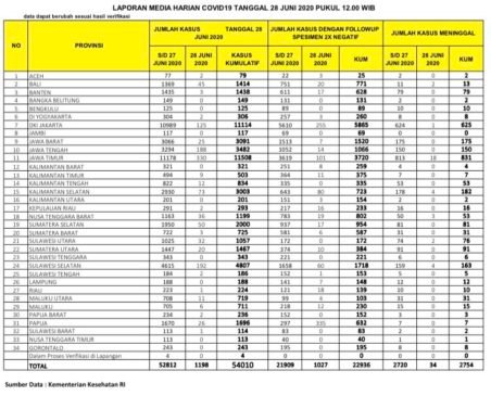 Data pasien Corona (Covid-19) ini tercatat sejak Sabtu 27 Juni 2020 pukul 12.00 WIB hingga hari ini Minggu 28 Juni 2020 pukul 12.00 WIB.