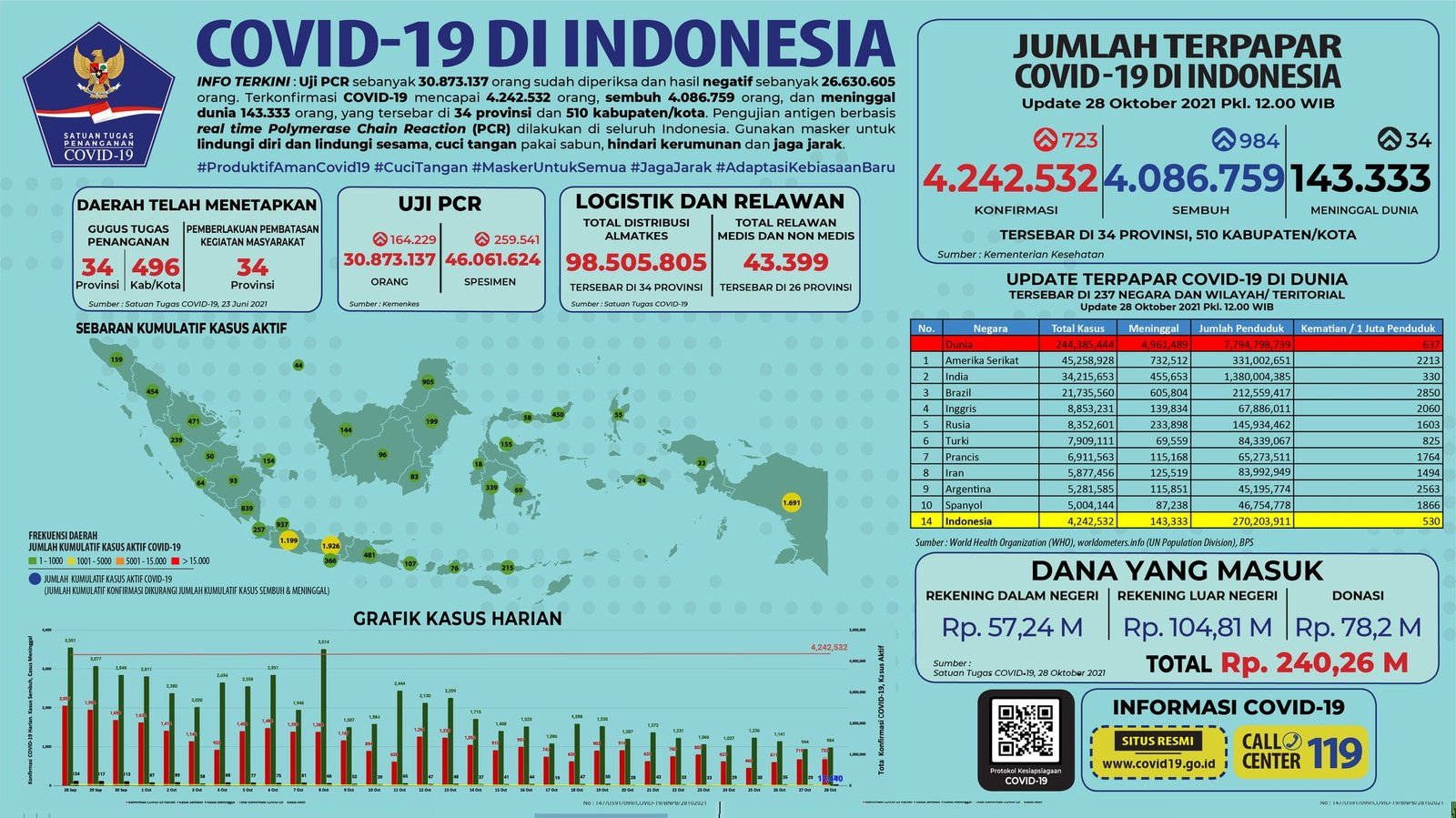 Sebelumnya pada Rabu (27/10/2021), jumlah akumulatif kasus positif berada di angka 4.241.809 dengan 4.085.775 di antaranya sembuh dan 143.299 meninggal dunia.