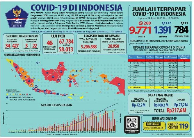 Data pasien Corona (Covid-19) ini tercatat sejak Senin 28 April 2020 pukul 12.00 WIB hingga hari ini Selasa 29 April 2020 pukul 12.00 WIB.