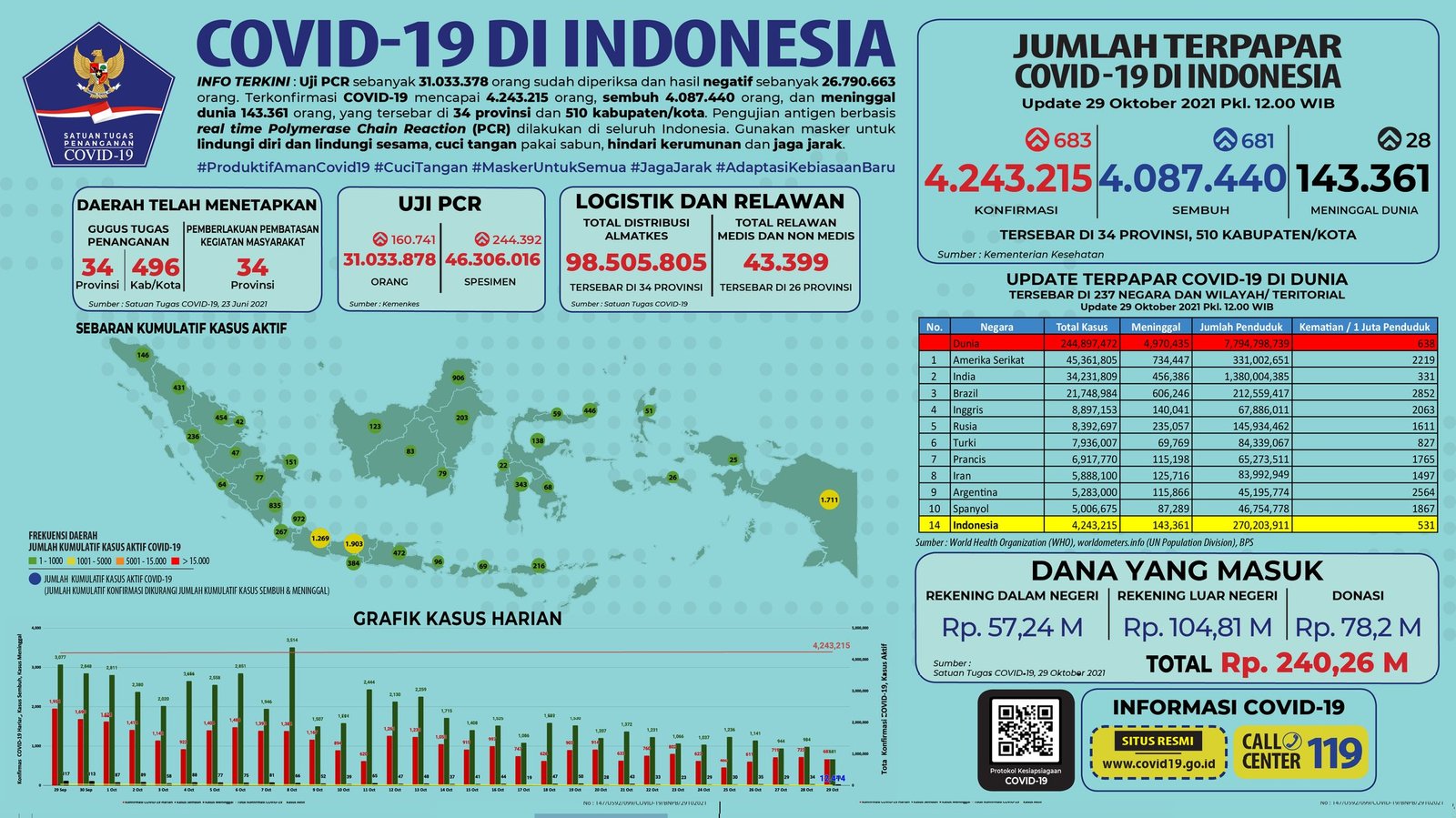 Sebelumnya pada Kamis (28/10/2021), jumlah akumulatif kasus positif berada di angka 4.242.532 dengan 4.086.759 di antaranya sembuh dan 143.333 meninggal dunia.