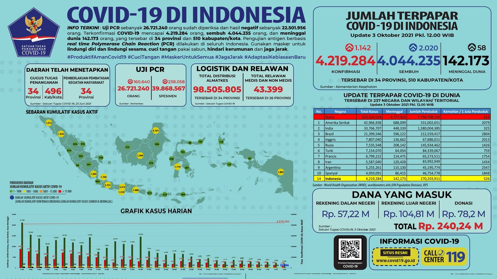 Sebelumnya pada Sabtu (2/10/2021), jumlah akumulatif kasus positif berada di angka 4.218.142 dengan 4.042.215 di antaranya sembuh dan 142.115 meninggal dunia.