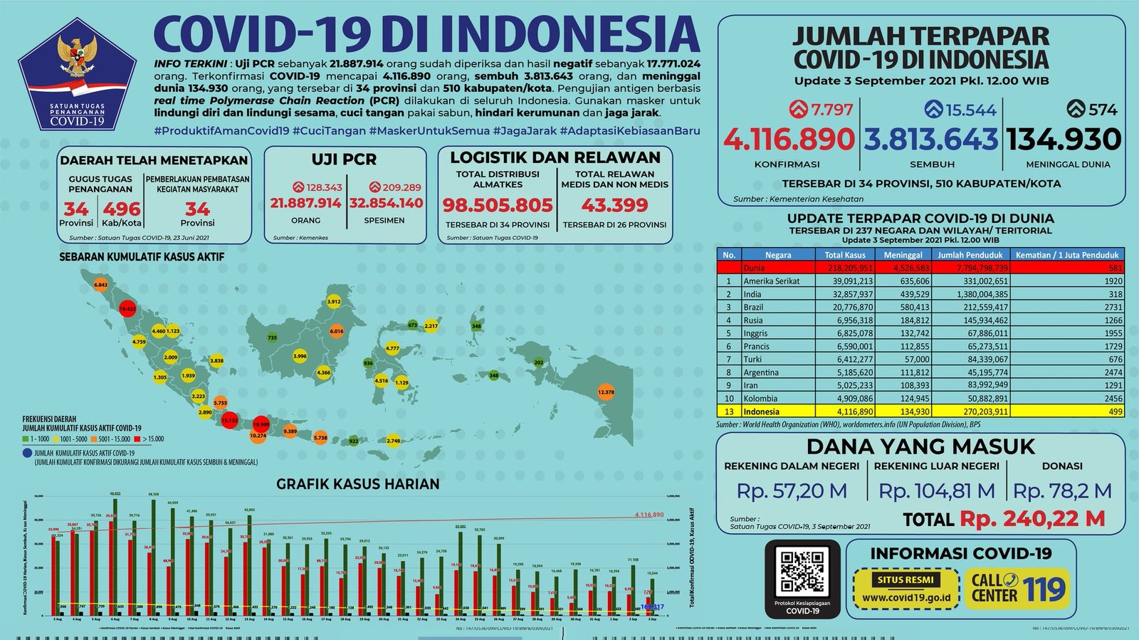 Update 3 September 2021 Korban Covid-19 di Indonesia: 4.116.890 Positif, 3.813.643 Sembuh, 134.930 Meninggal