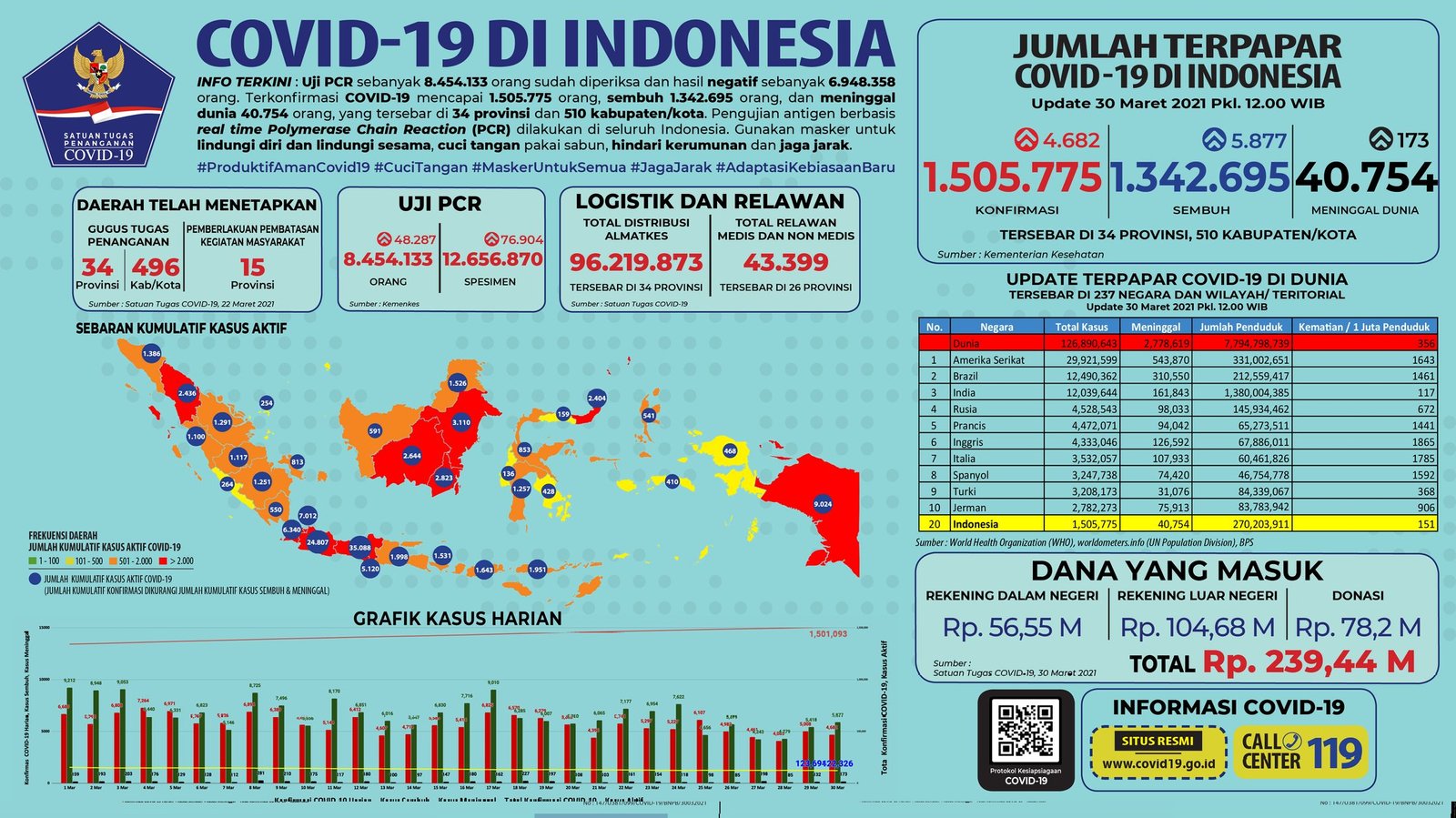 MATTANEWS.CO, JAKARTA– Pemerintah merilis kembali data akumulasi terbaru terkait sebaran kasus Virus Corona (Covid-19). Hingga Selasa (30/3/2021), Jumlah kasus positif virus corona (Covid-19) di Indonesia terus meningkat, bertambah 4.682 Kasus Baru Sehingga total yang positif mencapai 1.505.775 kasus.