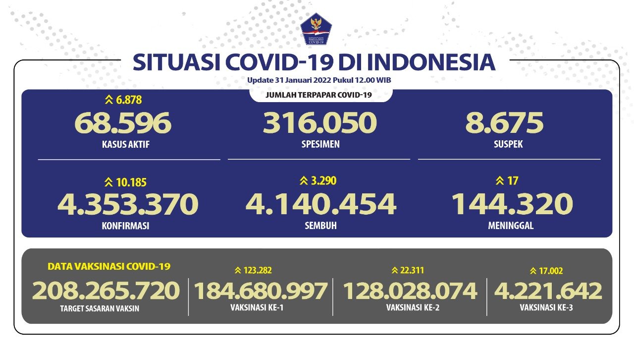 MATTANEWS.CO, JAKARTA– Pemerintah merilis kembali data akumulasi terbaru terkait sebaran kasus Virus Corona (Covid-19). Hingga Senin (31/1/2022), Jumlah kasus positif virus corona (Covid-19) di Indonesia terus meningkat, bertambah 10.185 Kasus Baru Sehingga total yang positif mencapai 4.353.370 kasus.