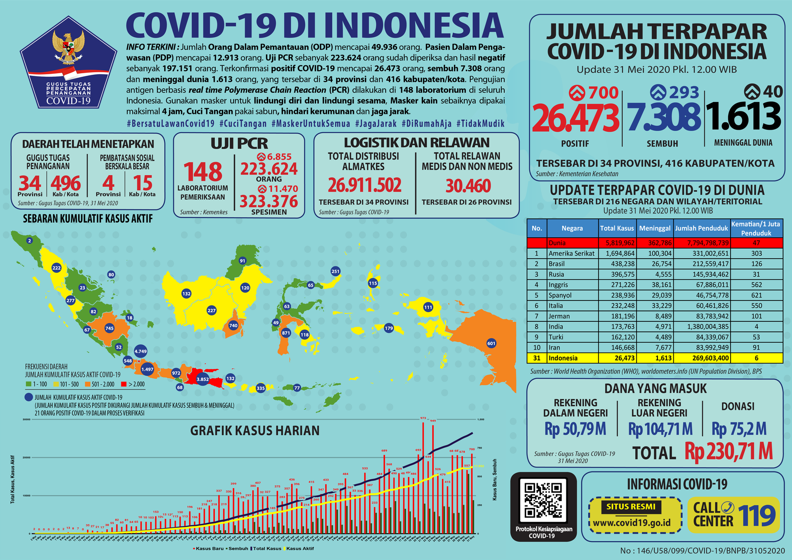 JAKARTA, Mattanews.co– Pemerintah merilis kembali data akumulasi terbaru terkait sebaran kasus Virus Corona (Covid-19). Hingga Minggu (31/5/2020), Jumlah kasus positif virus corona (Covid-19) di Indonesia terus meningkat, bertambah 700 Kasus Baru Sehingga total yang positif mencapai 26.473 kasus.