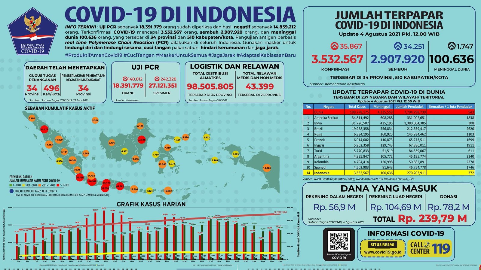 Sebelumnya pada Selasa (3/8/2021), jumlah akumulatif kasus positif berada di angka 3.496.700 dengan 2.873.669 di antaranya sembuh dan 98.889 meninggal dunia.
