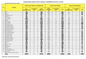 JAKARTA, Mattanews.co– Pemerintah merilis kembali data akumulasi terbaru terkait sebaran kasus Virus Corona (Covid-19). Hingga Rabu (4/11/2020), Jumlah kasus positif virus corona (Covid-19) di Indonesia terus meningkat, bertambah 3.356 Kasus Baru Sehingga total yang positif mencapai 421.731 kasus.