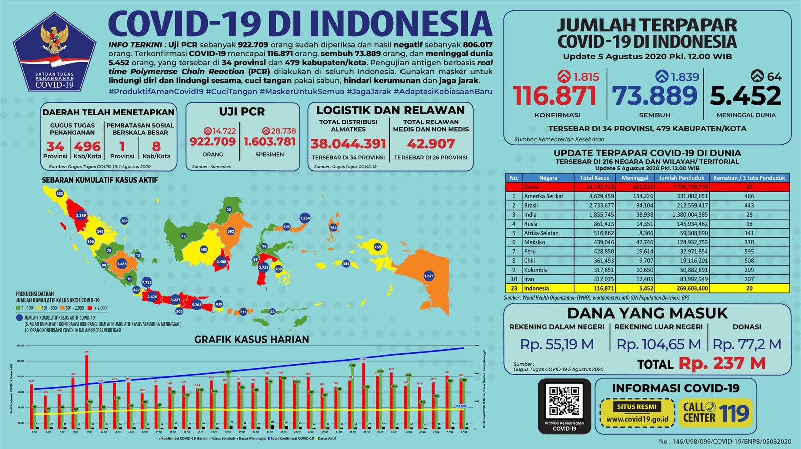 JAKARTA, Mattanews.co– Pemerintah merilis kembali data akumulasi terbaru terkait sebaran kasus Virus Corona (Covid-19). Hingga Rabu (5/8/2020), Jumlah kasus positif virus corona (Covid-19) di Indonesia terus meningkat, bertambah 1.815 Kasus Baru Sehingga total yang positif mencapai 116.871 kasus.