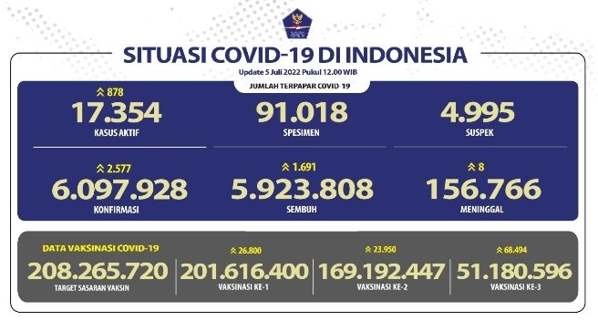 Update 5 Juli 2022 Korban Covid-19 di Indonesia: 6.097.928 Positif, 5.923.808 Sembuh, 156.766 Meninggal